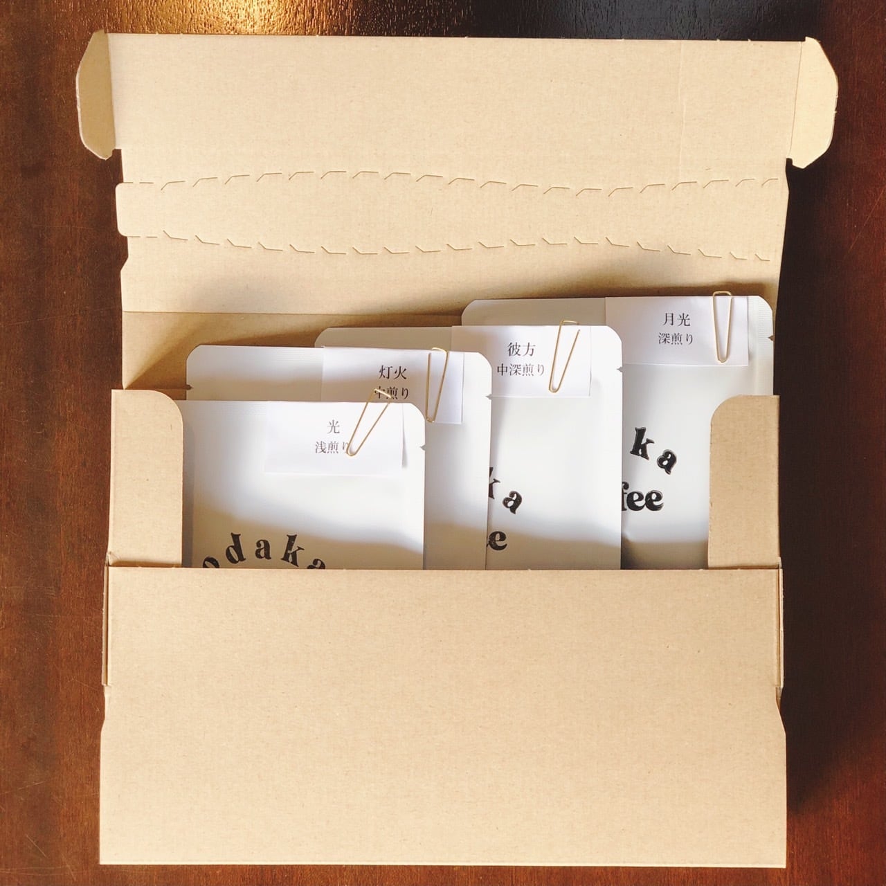 odaka coffeeこだわりのブレンド、中煎り・中深煎り・深煎り、合計4枚のセットになります。